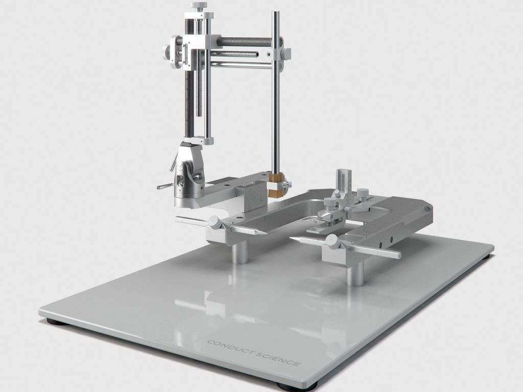 The microdrives facilitate movement in 3D spaces, with the help of three vernier scales, thus enabling movement along the anteroposterior (AP) ‘y’ axis, which describes a line moving from anterior to the posterior part of an animal’s head, the mediolateral (ML) ‘x’ axis running from midline to left or right side of the head, and a dorso-ventral (DV) ‘z’ axis running from skull’s surface to the interior of the brain. The travel amplitude of three micromanipulators is typically 80nm, each consisting of a graduated mobile arm that moves along the apparatus. Conduct Science offers a wide range of stereotaxic instruments according to your experimental needs.Ā