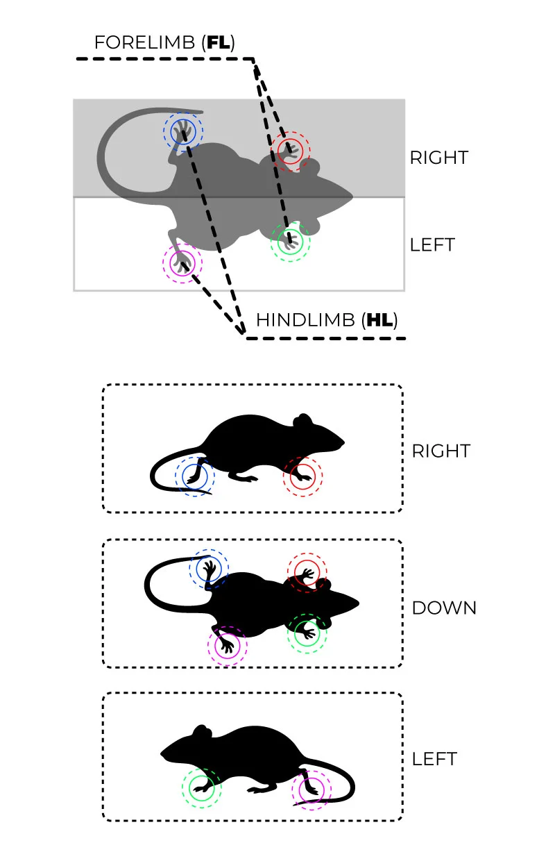 Deep learningābased pose estimation algorithms, such as DeepLabCut, SLEAP, or ConductVision, use convolutional neural networks to detect and track user-defined body parts, including forepaws, hindpaws, joints, snout, and tail. Representative frames from the recorded videos are first selected and manually labeled to teach the algorithm what each body part looks like under various postures and lighting conditions. By training on these labeled frames, the network learns to recognize the same features in new, unlabeled videos.4,14