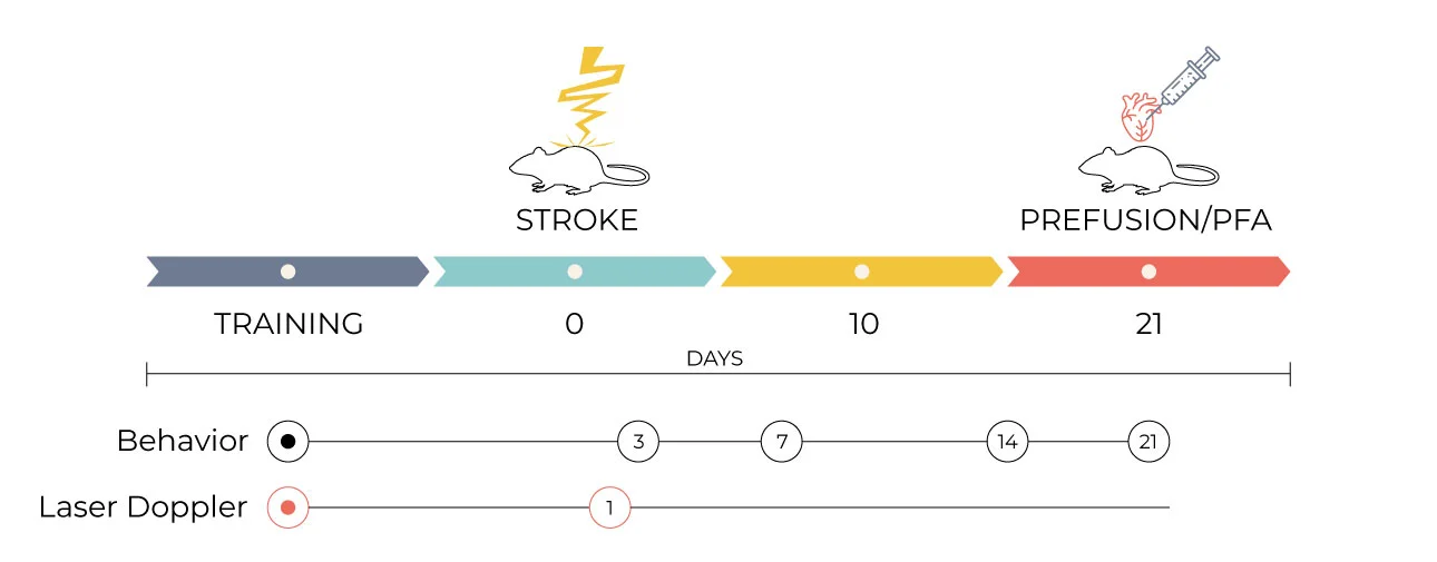 After the induction of stroke, the animals are given a recovery period of ideally 3 weeks, during which behavioral testing is conducted at several time points; before the stroke, and on days 3, 7, 14, and 21 after the stroke.3 Such repeated assessments allow the researcher to monitor both immediate and gradual impairments and improvements.