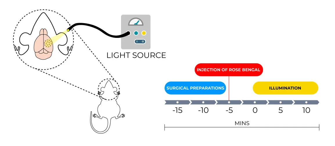 The photothrombotic model combines a light-sensitive dye (commonly Rose Bengal) with targeted illumination of a cortical region.7,8 After the activation of the dye by green light (typically 532 nm), reactive oxygen species is generated in the blood vessels which causes endothelial damage and microvascular clot formation. This leads to localized ischemia in the illuminated area, creating a reproducible infarct that affects motor function. Unlike the middle cerebral artery occlusion (MCAO) model, which produces variable infarct sizes and higher mortality, photothrombosis allows precise control over lesion location and size.