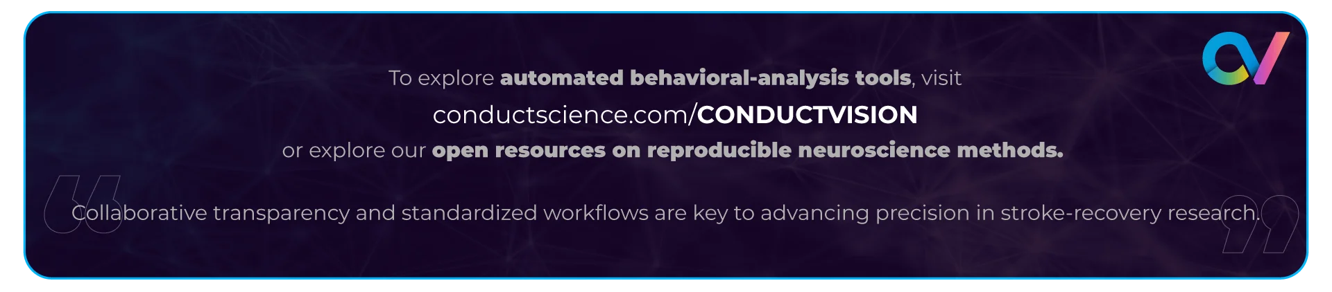 All behavioral tests are recorded using high-speed cameras under uniform lighting, ensuring that every movement is captured with sufficient resolution for computational analysis. Controlled testing environments minimize stress which in turn reduces variability and ensures that the measured changes reflect true recovery rather than environmental factors. Repeating trials for each test allows for averaging and more reliable assessment.4,5