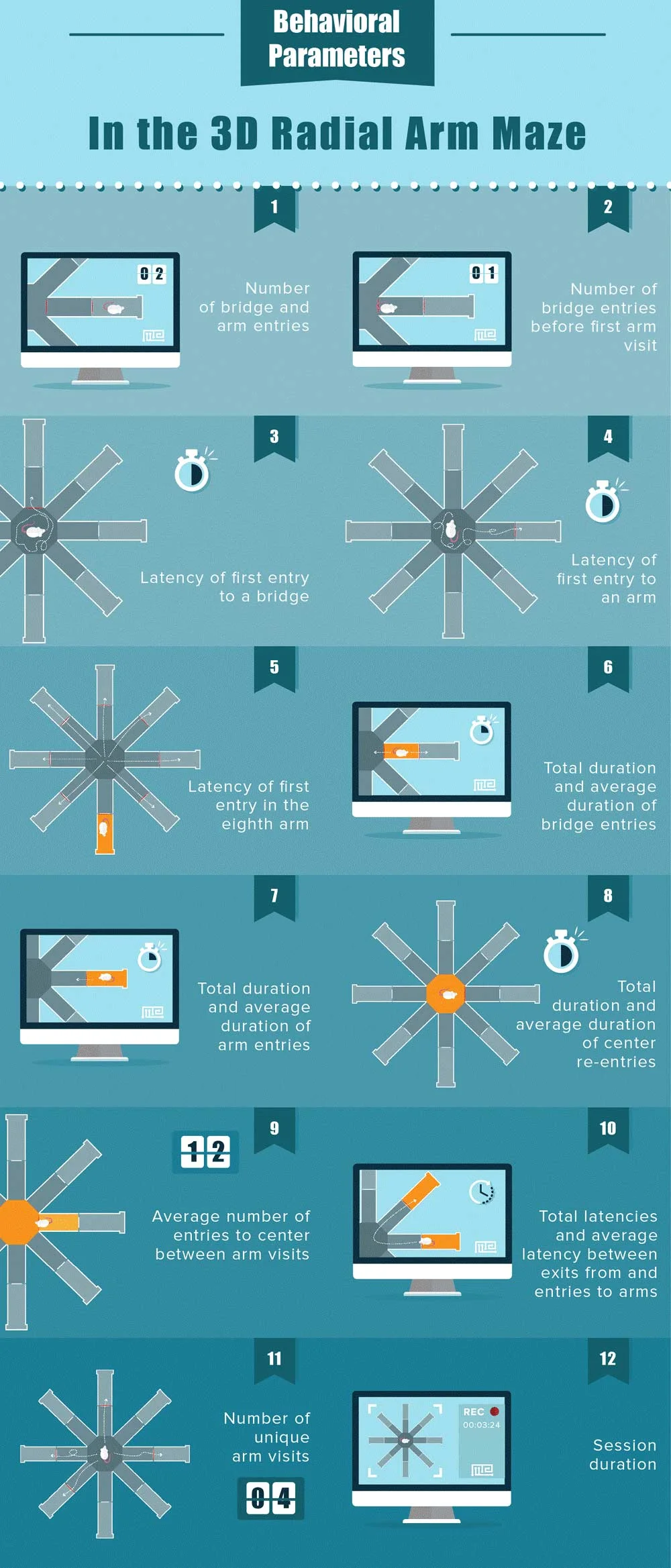 The general 3D Radial Arm Maze procedure involves setting up the apparatus in the desired configuration and placing the subject on the central platform. The subject is allowed to traverse the setup freely, and the activity is recorded through Noldus Ethovision XT. The apparatus is cleaned and sanitized before every test to minimize the effect of any olfactory residue. The subject is placed on the central platform as the starting position.