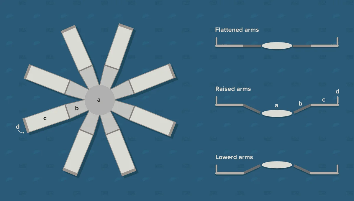 Segment 1: 15.2 cm × 11.2 cm directly attached to the central platform | Segment 1: 20 cm × 15 cm directly attached to the central platform |