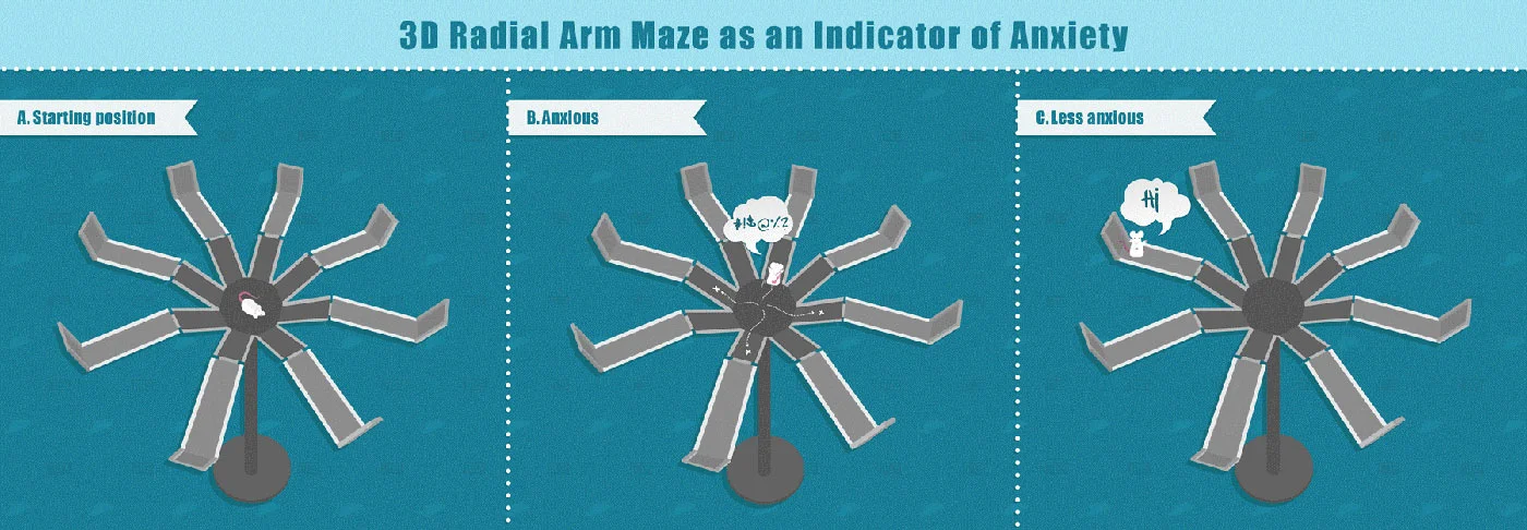 - Unlike the previous model, 3D Radial Arm Maze doesn’t provide subjects with the choice between safe and anxiolytic spaces.