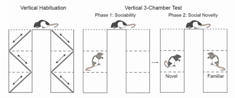 • Three-Dimensional Design: The VM consists of a standard three-chamber maze elevated above multilevel columns. This setup allows for the presentation of conspecifics (other rats or mice) at varying spatial distances and familiarity levels beneath the main chamber.
