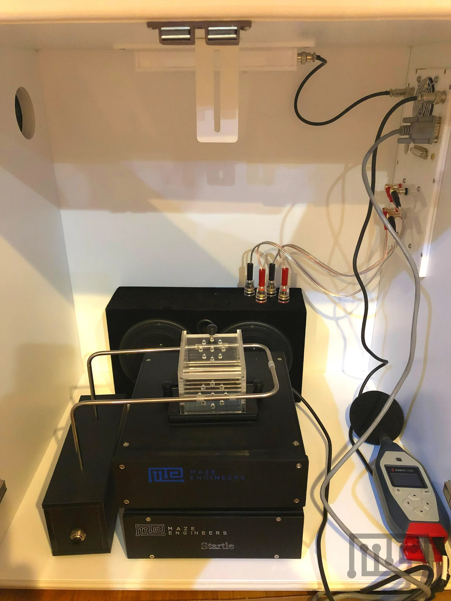 The Acoustic Startle Response Chamber is employed to study the mechanisms underlying sensorimotor integration. This chamber measures the startle response, a defensive reflex triggered by abrupt or threatening auditory stimuli, often resulting in rapid eye closure and muscle contractions. In animals, this response can occur in situations resembling predator encounters and is therefore also termed the escape response (Fetcho & McLean, 2009). The startle circuitry involves short neural pathways with fast-conducting neurons responsive to various sensory inputs, which then connect to large motor neurons that exhibit strong excitation when exposed to startle stimuli (Fetcho & McLean, 2009). This response is valuable for exploring cellular functions and synaptic connections.