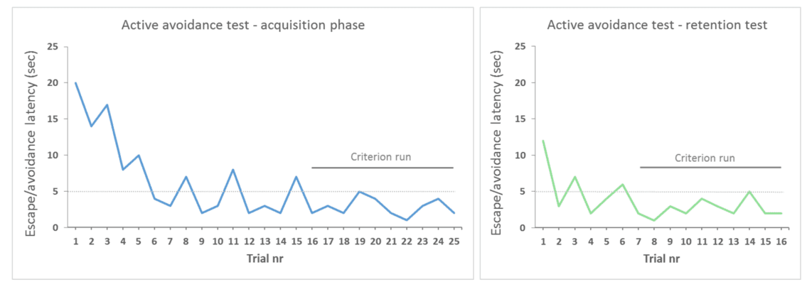 For the active avoidance test, results can be presented in different ways depending on the chosen protocol. If the escape or avoidance latency is measured in consecutive trials until the criterion run is reached (e.g. 9 avoidances in 10 consecutive trials), results may be graphed as escape/avoidance latencies throughout trials (the time between the CS and the US defines the cutoff time between avoidance and escape behavior).