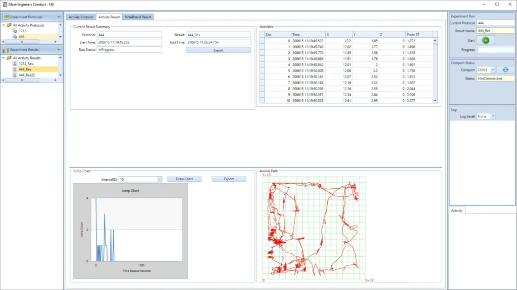Users can choose a time interval post experiment and draw an activity chart indicating the location, number, and timing of jumps as time, and count points. For example, (10,4) indicates 4 jumps within 10 seconds. The following results are recorded: When a jump occurs When the animal moves without a jump When the animal moves while in the jump position Number of times the animal jumped during a given duration