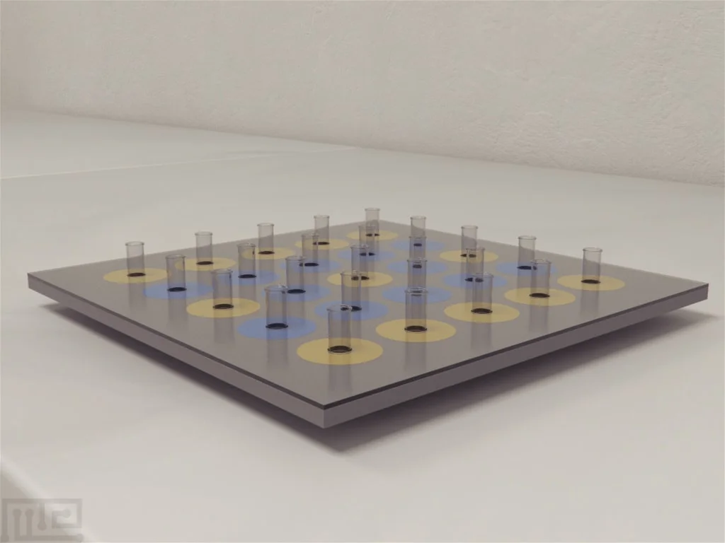 The artificial flowers are represented by Eppendorf tubes, each 4 cm deep, placed within the 24 holes of the acrylic plates. These tubes protrude 1.8 cm above the upper transparent acrylic plate. Surrounding each Eppendorf tube are 24 colored circles—12 blue and 12 yellow—with a diameter of 3.8 cm. These circles are visible through the upper transparent plate, centered around the Eppendorf tubes.