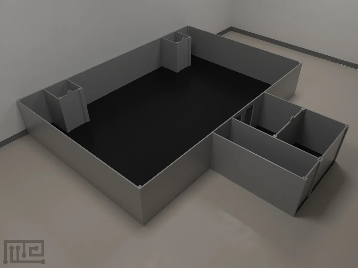 - It consists of an open area that has a start box connected to it via an antechamber. Inside the arena, two-goal boxes are placed at the back wall near the corners.