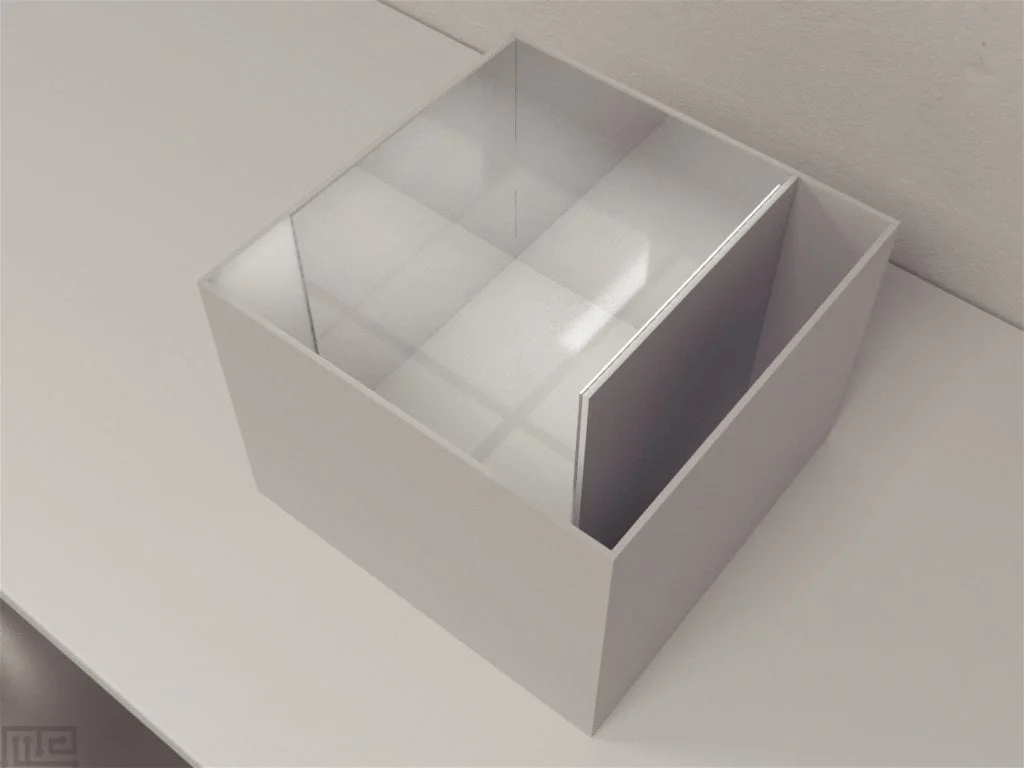 The second design, based on Paterson’s model, uses a nested chamber design. The larger outer box (38 x 38 x 29 cm) has one mirrored wall while remaining surfaces are opaque. A smaller (28 x 28 x 28 cm) box that has all its 5 inner-surface paneled with mirrors in placed in the center of the larger box, thus creating alleyways around itself.