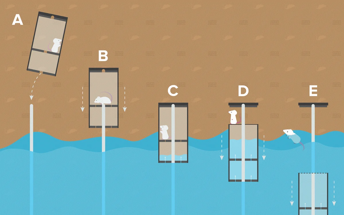 As water fills the lower section, the rodent ascends the cylinder, exploring its perimeter. With the gradual submersion of the lower section, approximately 45 to 50 seconds later, the entire device sinks beneath the water’s surface. This prompts the rodent to begin navigating the maze, with minimal time available to rely on external cues.