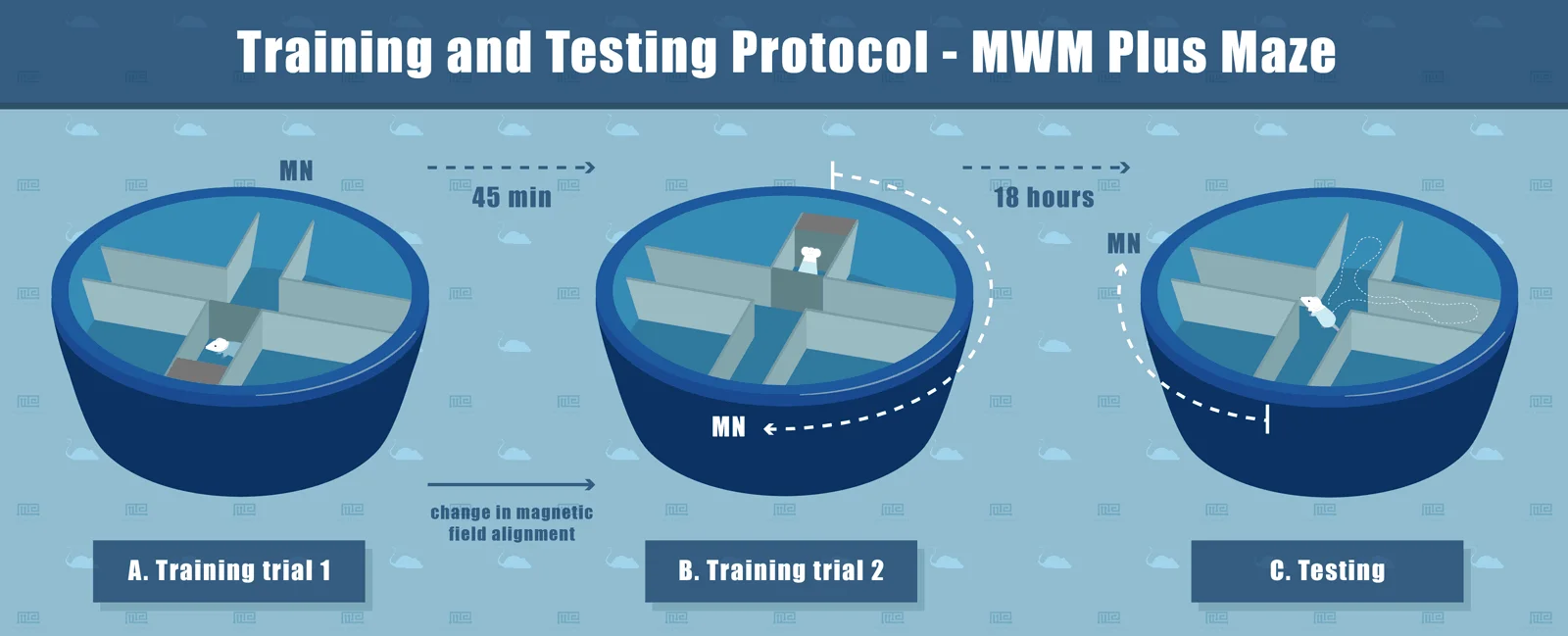 Spatial exploration spans various vertebrate classes and encompasses an array of cues such as visual, olfactory, and auditory stimuli. Particularly noteworthy is the ability of animals to utilize the geomagnetic field and magnetic cues for spatial orientation—a phenomenon known as magnetoreception. While the traditional Morris water maze task (Morris, 1984) serves as a reliable measure of spatial ability, its limitations in studying magnetoreception prompted the development of the MWM plus maze (Phillips et al., 2013).