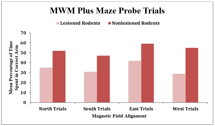 The data analysis involved plotting the mean percentage of time spent in the correct arm during the probe trial, relative to the position of magnetic north. The results depicted on the graph reveal a significant disparity between the lesioned and control groups. Specifically, the lesioned group exhibited notably impaired performance compared to the control group. These findings strongly indicate that rodents with lesions experienced altered or possibly eliminated directional responses to magnetic cues.