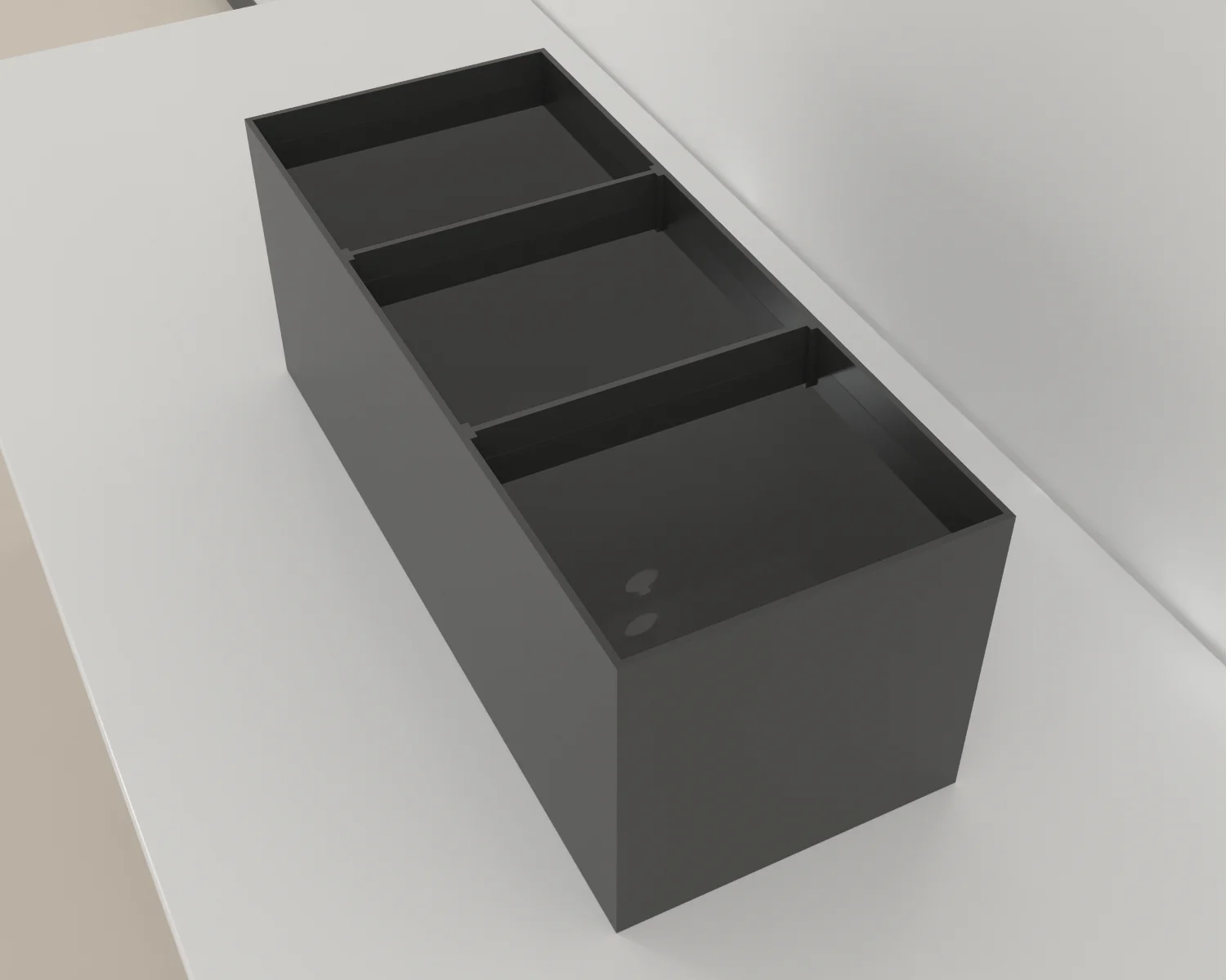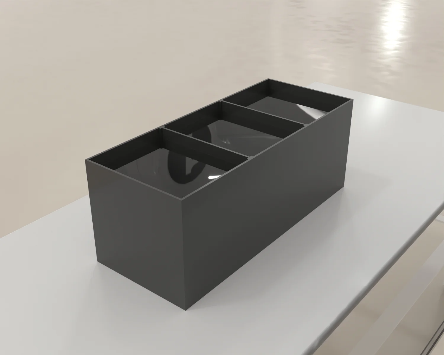 The Octopus three-chambered social apparatus can be used to study social behaviors in octopuses by examining the time the subject spends near a social object versus a novel object. The black plexiglass walls prevent the subject from viewing the inside of the lateral chambers; therefore, the subject needs to enter the chambers to view the objects. This allows the apparatus to also be used for two-choice experiments. The apparatus is large enough to place adult animals.