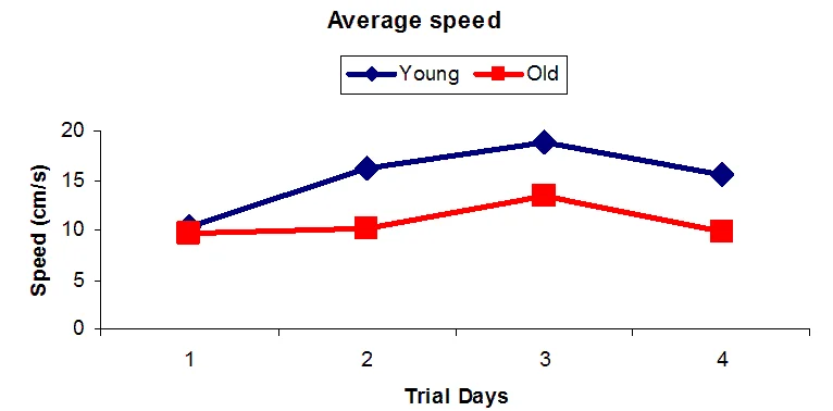 In exploring the effect of age on spatial learning and memory, rats of two age groups (young: 6 months; old: 21 months) partake in RAWM tasks. Placed in one of the seven start arms facing the wall, each subject has 120 seconds to locate the escape platform. Upon discovery, subjects rest on the platform for 15 seconds. Platform position remains consistent for the first three days before changing on the fourth day. Testing occurs over four days, with five trials conducted daily and a 30-minute inter-trial interval.