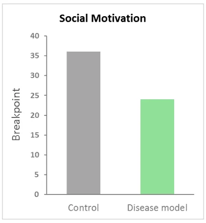 Using graphs similar to these to compare social motivation between control and disease or treatment groups allows for easy visualization of the effects on social behavior. Animals with impaired social behavior may be less motivated to press the lever more times in order to obtain a social reward.