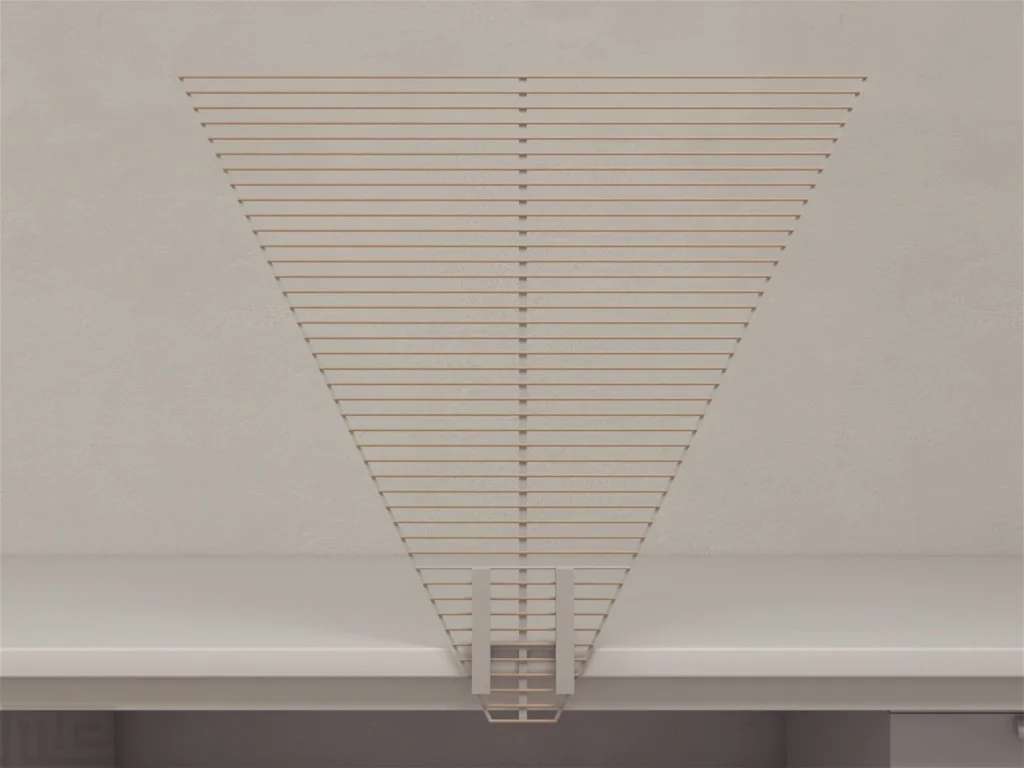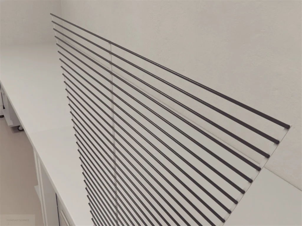 The Stairway apparatus features a vertically mounted triangular ladder, with the apex of the triangle serving as the base. The ladder stands 100 cm tall, with the widest rung measuring 90 cm in width. Each rung has a diameter of 0.4 cm and is spaced 2 cm apart, totaling 42 rungs. The apparatus is typically set at an inclination of 80 to 90 degrees relative to the ground, ensuring that during the experiment, the subject can only see the sides and the ceiling of the setup.