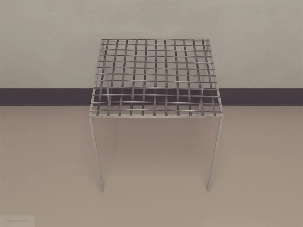 The Stairway apparatus features a vertically mounted triangular ladder, with the apex of the triangle serving as the base. The ladder stands 100 cm tall, with the widest rung measuring 90 cm in width. Each rung has a diameter of 0.4 cm and is spaced 2 cm apart, totaling 42 rungs. The apparatus is typically set at an inclination of 80 to 90 degrees relative to the ground, ensuring that during the experiment, the subject can only see the sides and the ceiling of the setup.