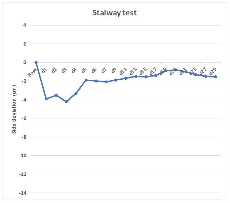 The Stairway test assesses how far the subject deviates from the central axis of the ladder. Deviations can range up to 45 cm on either side of this central point, which is designated as zero. Deviations to the left are recorded as a maximum of -45 cm, while deviations to the right are recorded as +45 cm. The data from each daily session is the average of five trials.