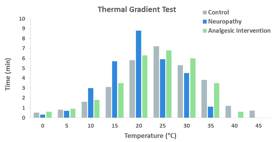 In the example below the Thermal Gradient Test is applied, during 30 min, to a control group, a neuropathy group exhibiting heat allodynia, and an intervention group treated with an analgesic drug.