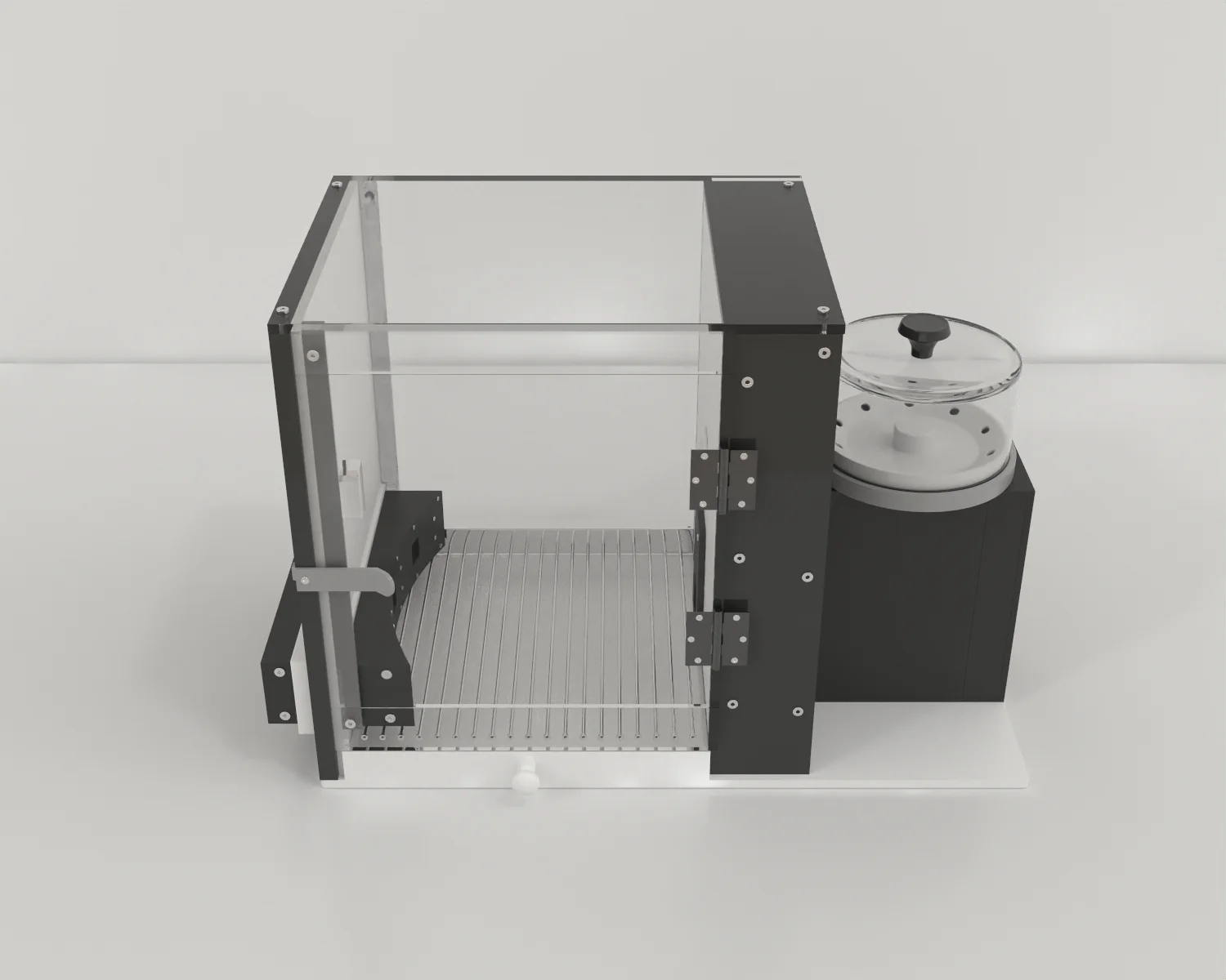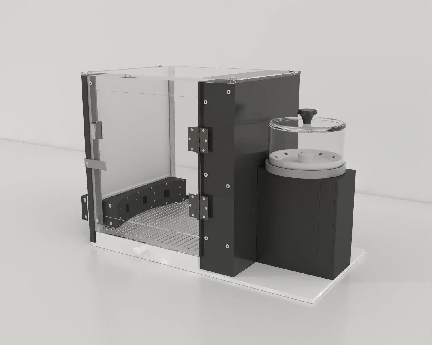 The 3CRSTT Apparatus can be used to study attention and impulsivity in rodents. Different aspects of attention, such as sustained attention and selective attention, can be assessed using this apparatus. The 3CRSTT Apparatus contains five nose poke apertures, so the visual cue signal can vary between these five apertures across trials to challenge the subject’s attention. Furthermore, variations can also be presented in the visual cue duration and pre-cue delay between trial onset and visual cue presentation across trials. The apparatus contains a shocker grid floor to punish the subjects if they respond incorrectly during trials. Additionally, the house light can also be turned off for a brief moment of darkness as a less aversive form of punishment.