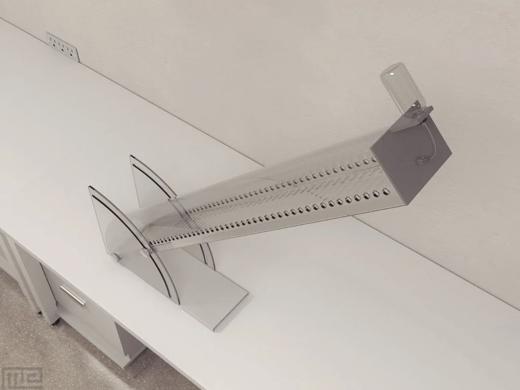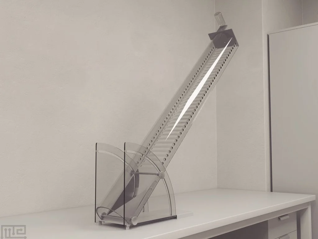 The Tilt Ladder is made from transparent acrylic and features a tube-like structure with a length of 65 cm and an internal height of 6 cm. It includes 45 removable rungs, each measuring 13 cm in length and 0.3 cm in diameter. The rung placement holes are spaced 1 cm apart, enabling various configurations of bar arrangements. One end of the ladder is mounted on a pivot point, allowing for adjustments in inclination from 0 to 90 degrees, while the other end is fitted with a dispenser for food and water.