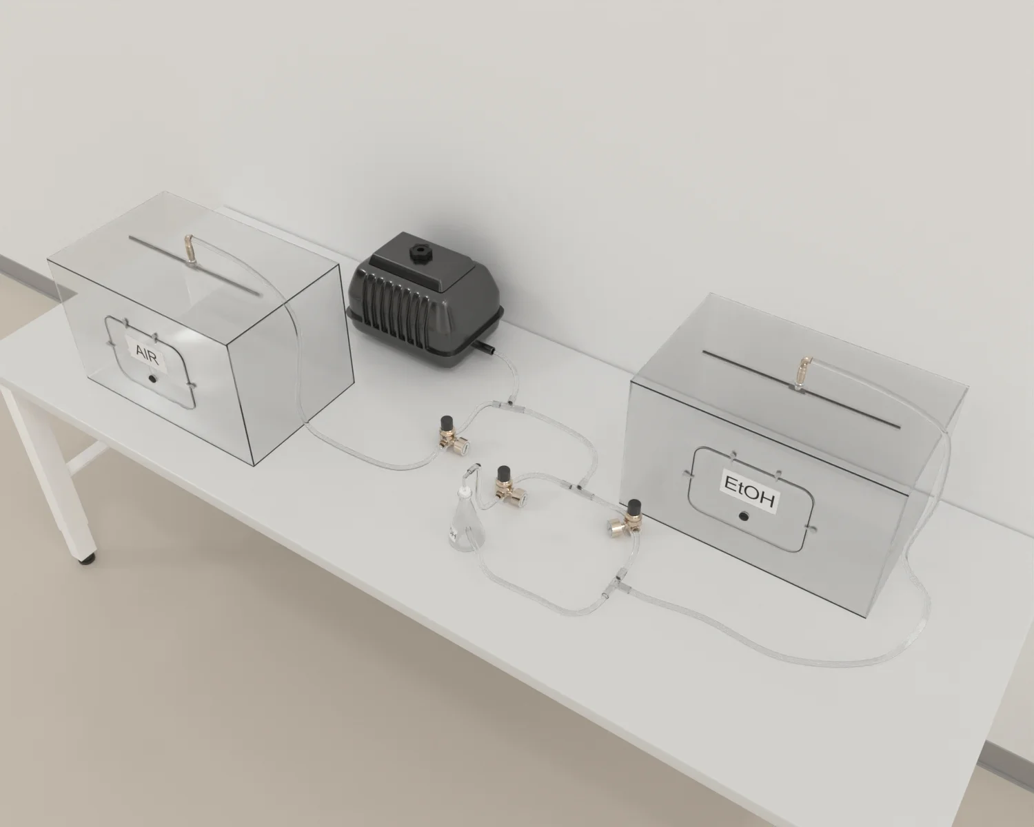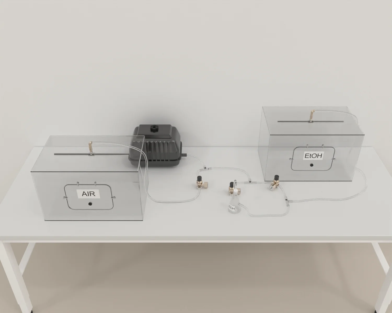 Adjust the airflow so that the amount of air bubbling through the ethanol is roughly half the volume of the plain air being mixed with it. The total airflow of the ethanol-air mix should equal the flow of plain air.Equilibration Period:
