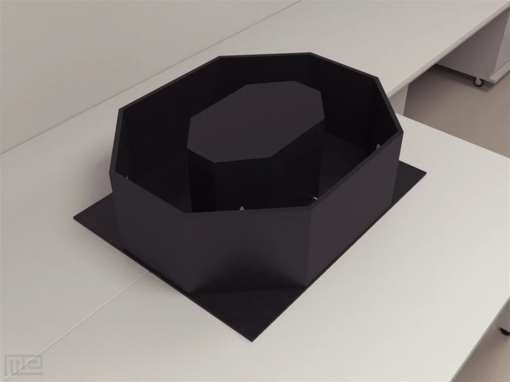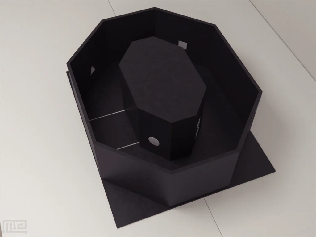 The whisker-guided exploration apparatus features an oval track that is 25 cm wide, consisting of both straight paths and turning corners. The straight sections of the track measure 50 cm in length on the outer side and 30 cm on the inner side. The corners are shaped by outer walls that are 30 cm long and inner walls that are 10 cm long. All the walls in the apparatus stand 30 cm high. The walls are painted black, adorned with white geometric shapes positioned at regular intervals along the track. The entire apparatus rests on a base that is 100 cm long and 80 cm wide, with a start box located on the longitudinal side of the setup.