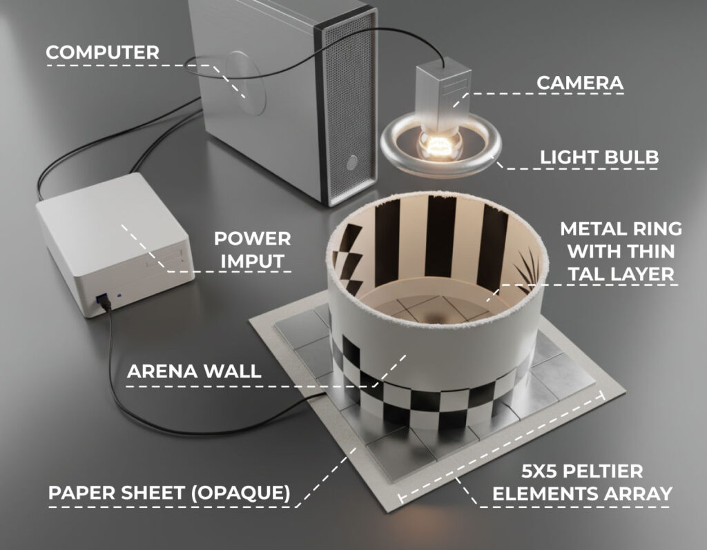 The Heat Maze is a setup used to study learning and memory in fruit flies (Drosophila melanogaster). It includes a temperature-controlled arena where certain areas are heated to act as aversive stimuli while only one area is maintained at a safe temperature for the fly. This setup enables researchers to test how flies learn to avoid dangerous areas and navigate toward safe zones [2].Ā Ā