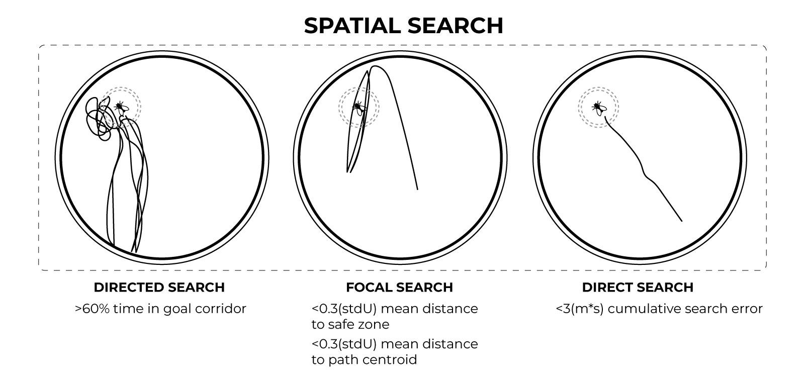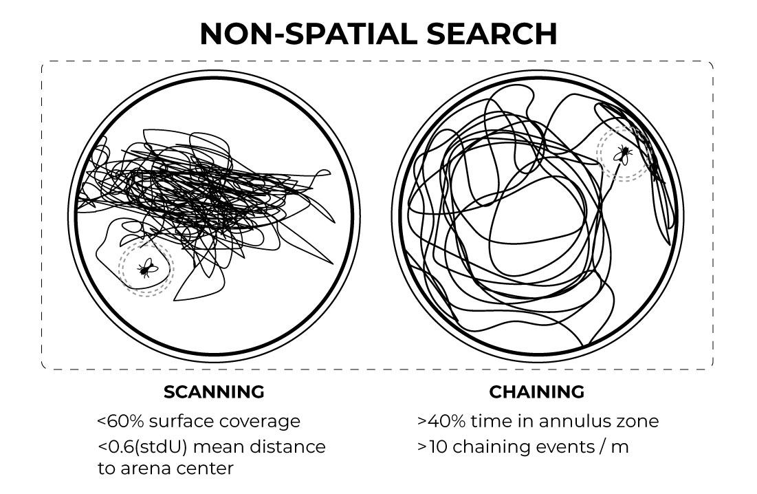 - Sometimes the fly explores only the central area with visual cues without truly learning the space, a search strategy known as “Scanning.”